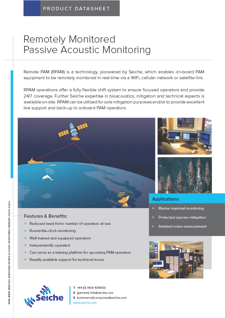 RPAM operations offer a fully flexible shift system to ensure focused operators and provide 24/7 coverage. Further Seiche expertise in bio-acoustics, mitigation and technical aspects is available on-site. RPAM can be utilised for sole mitigation purposes and/or to provide excellent live support and back-up to onboard PAM operators.