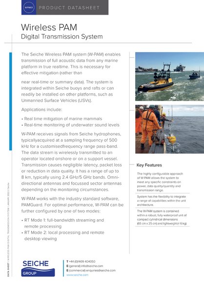 The Seiche Wireless PAM system (W-PAM) enables transmission of full acoustic data from any marine platform in true real-time.